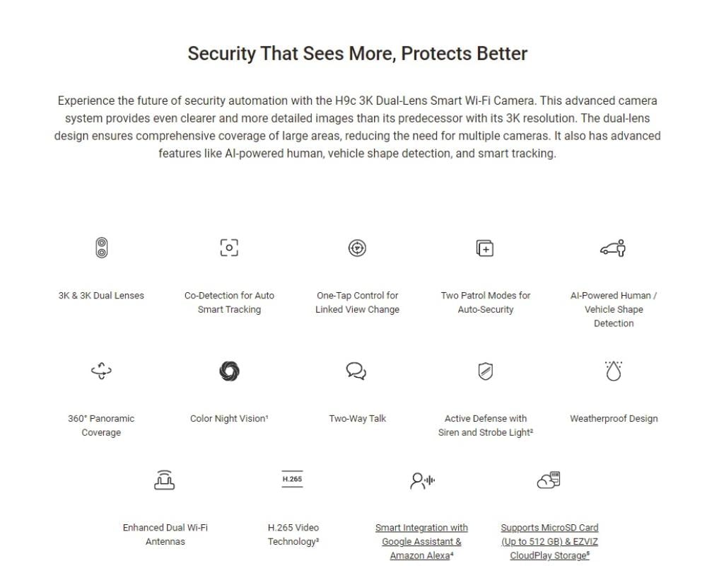 توفر كاميرا EZVIZ H9C حماية متقدمة بفضل دقة تصويرها الفائقة بجودة 3K، ما يضمن وضوحًا عاليًا وتفاصيل دقيقة في كل زاوية. تجمع الكاميرا بين عدسات مزدوجة وتقنيات الذكاء الاصطناعي، إلى جانب رؤية ليلية ملونة، مما يجعلها مناسبة لمراقبة المساحات الواسعة بكفاءة وموثوقية. كما تدعم تخزينًا قابلاً للتوسعة حتى 512 جيجابايت، لتلائم مختلف احتياجات المراقبة.